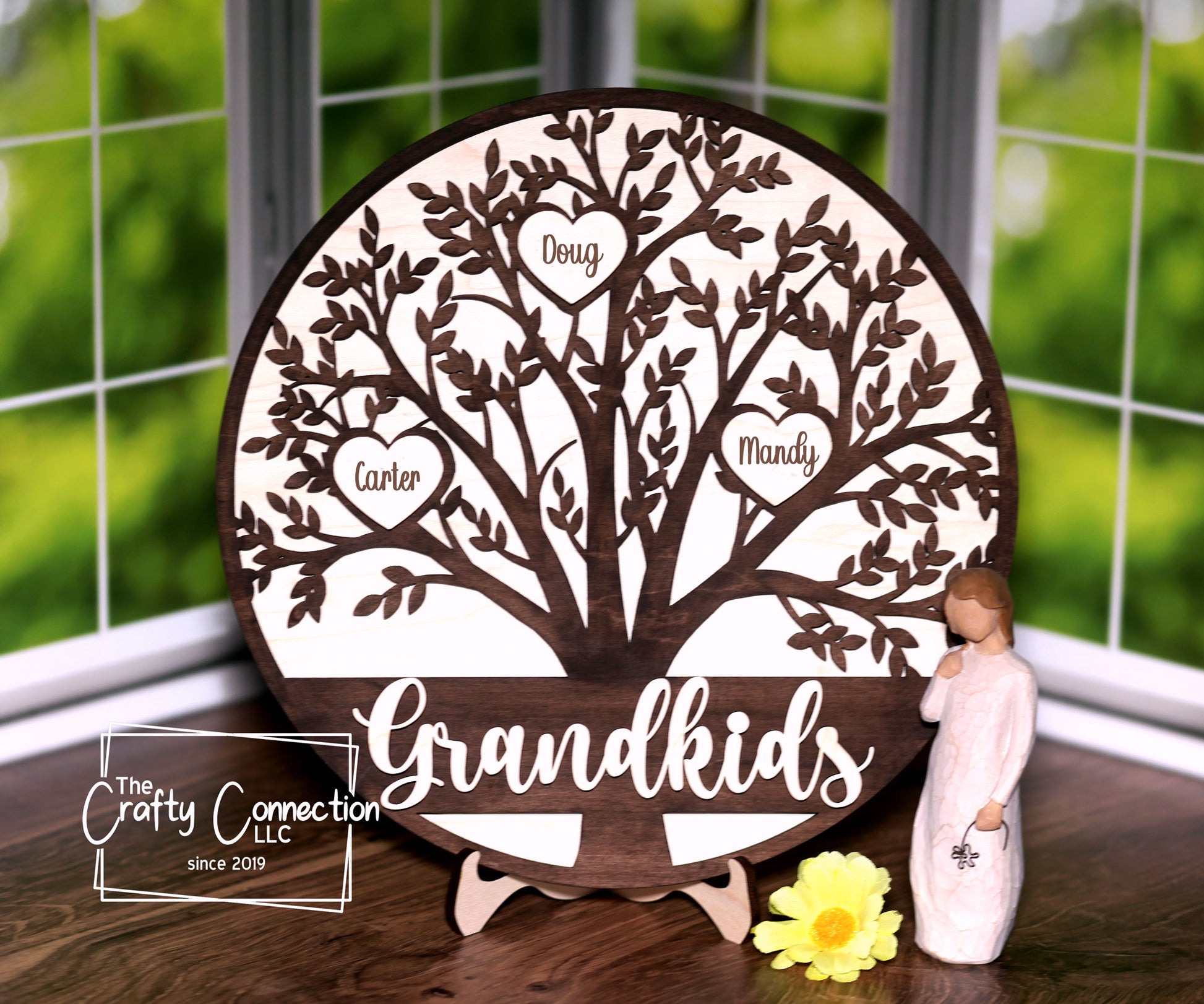 Finished design is approximately 11.25 inches in diameter, and nearly 3/4 inches thick with hearts and "Grandkids". Includes matching stand to display your beautiful sign. Names are laser engraved on the hearts.